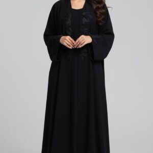 تأتي هذه القطعة بتصميم واسع (Oversized) يجمع بين الفخامة والراحة، مع أكمام واسعة تمنحكِ هيبة وأناقة لافتة. تتميز العباية بـ تطريز زهري بارز باللون الأسود على طول الجانب الأيمن والأكمام، مما يضيف لمسة فنية عميقة دون إخلال ببساطة التصميم.