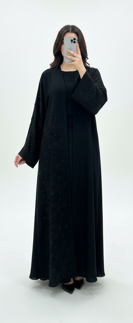نوع المنتج: عباية مفتوحة كلاسيكية بتفاصيل يدوية ناعمة.